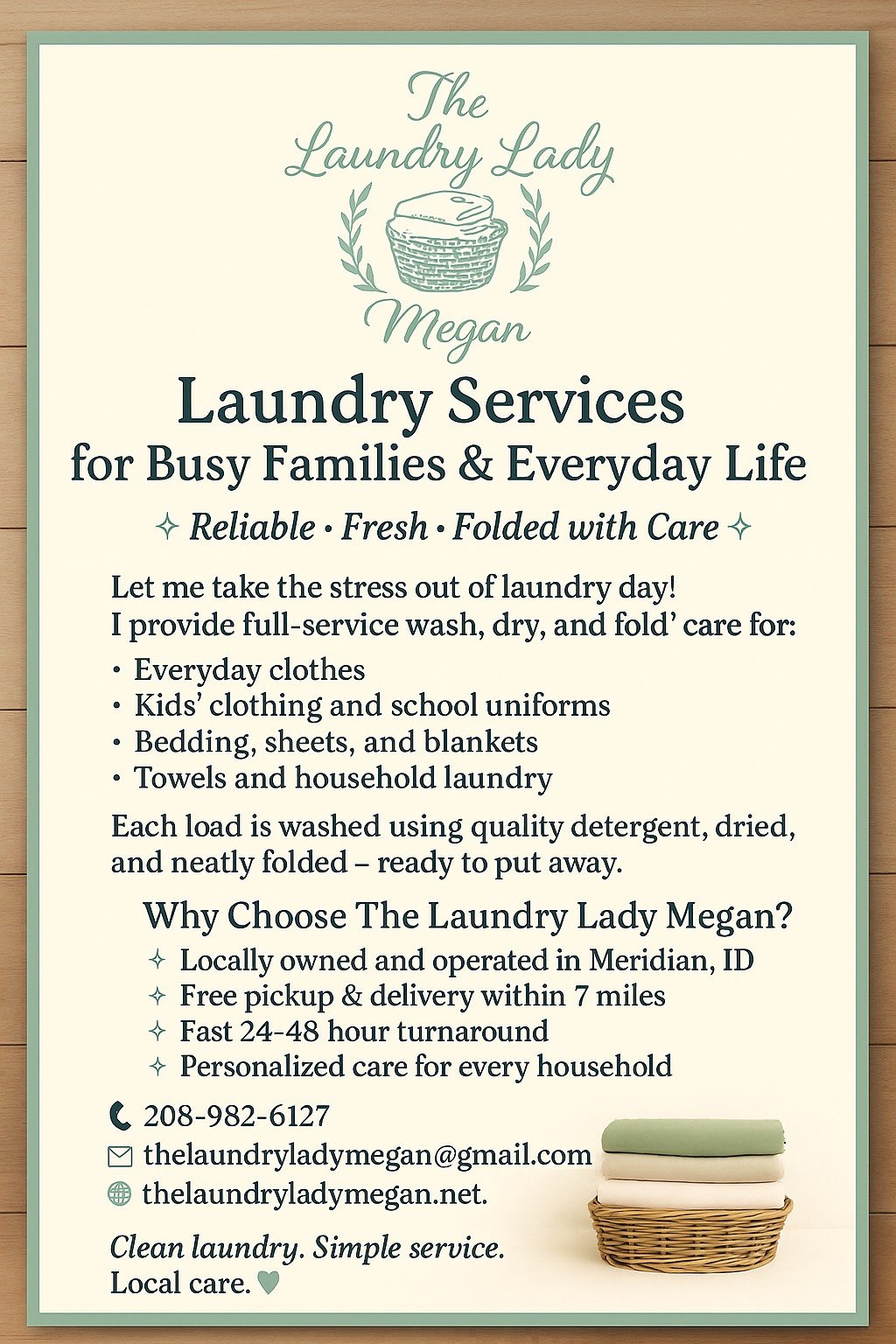 Every load tells a story, from piles of messy laundry to fresh, folded, and ready-to-go. Browse through the gallery to see how The Laundry Lady Megan helps families and businesses enjoy more time, less stress, and beautifully fresh laundry. Pictures and videos coming soon!